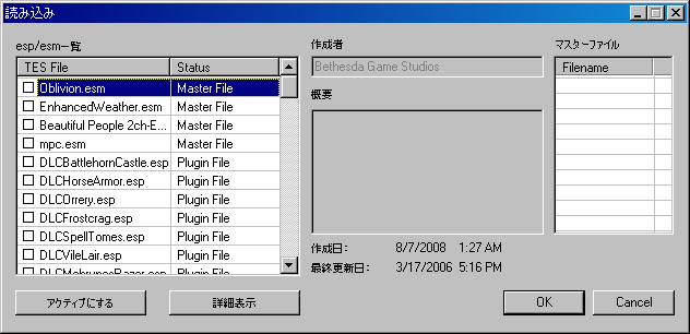 読み込みたいマスターファイル、プラグインファイルの名称をダブルクリックすることで、左側のボックスにペケが入ります。今回は関係しませんが、拡張子がespであるプラグインファイルを編集したい、改変したいという場合は左下の「アクティブにする」(Set as Activate File)ボタンを押す必要があります。