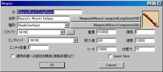 しばらく下の方へスクロールすると、BaurusAkaviriLongSwordというEditor IDが見つかるでしょう。ダブルクリックすると次のようなダイアログが出てきます。