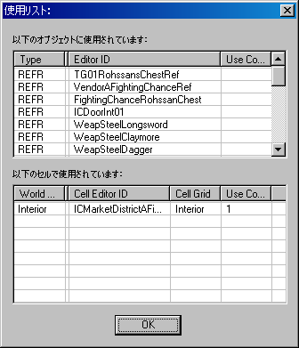 ここに、ChestVendorSmithBladesI01というEditor IDのコンテナがあります。Rohssanの店に存在するコンテナですが、実はこのコンテナ、Use Infoを見ればわかるようにImperial CityのSlash 'n Smashにも、LeyawiinのThe Dividing Lineにも同じEditor IDを持つコンテナが配置されています。いずれもベンダーのMerchant ContainerとしてReferenceに指定されていますから、それぞれの在庫になっているということです。