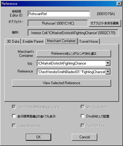 今表示しているのはMerchant Containerのタブです。なんとなく、今回話題となっているフレーズが出揃った気がしますね。Referenceにあるのは、ベンダーとしてのNPCに関連づけられているコンテナです。